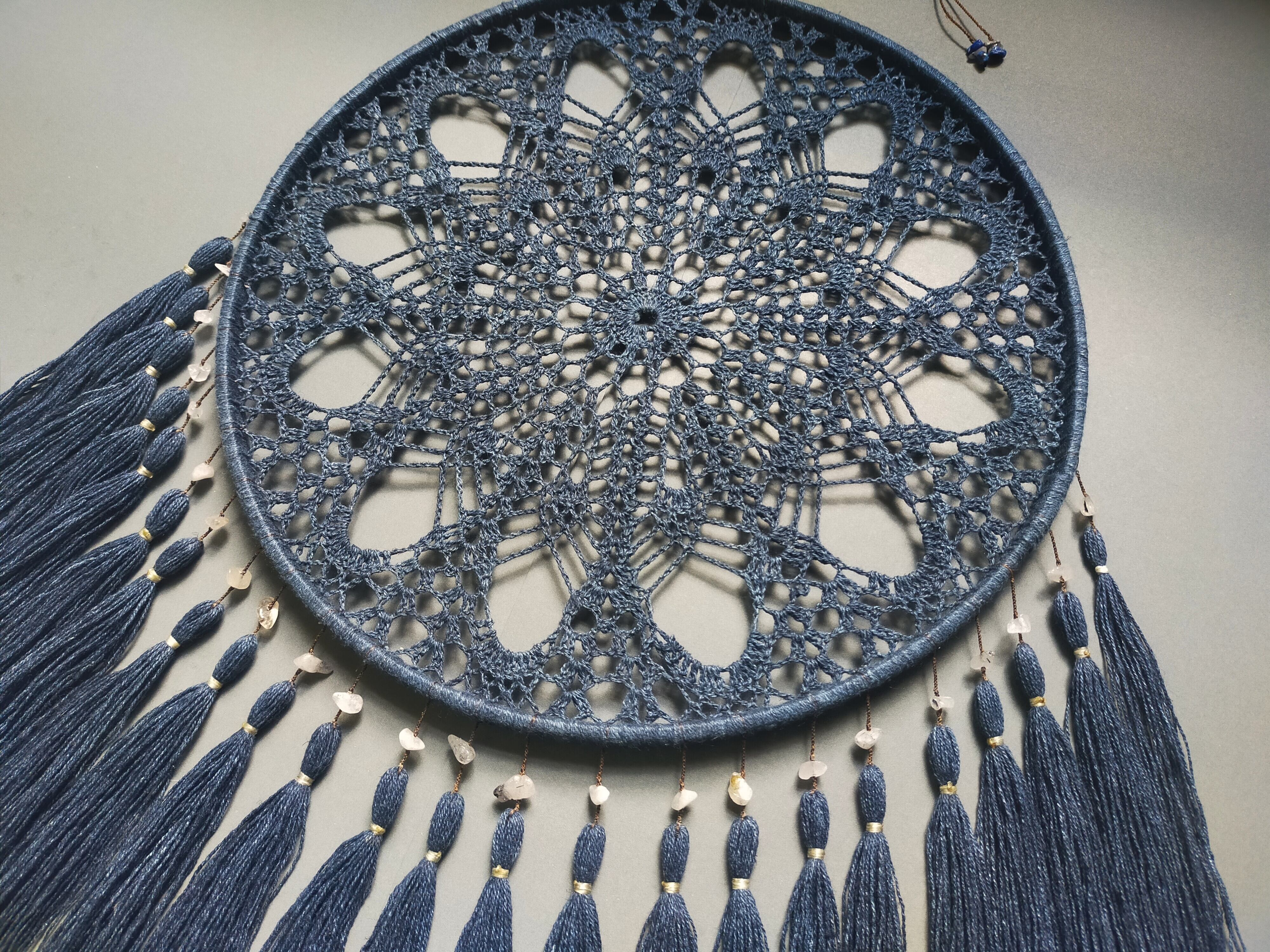 • dreamcatcher作品は、タイの天然藍染め麻糸100%を使用しています。サークル内は、かぎ編みで曼荼羅模様に仕上げ、ひと目ひと目丁寧に編んでいます。