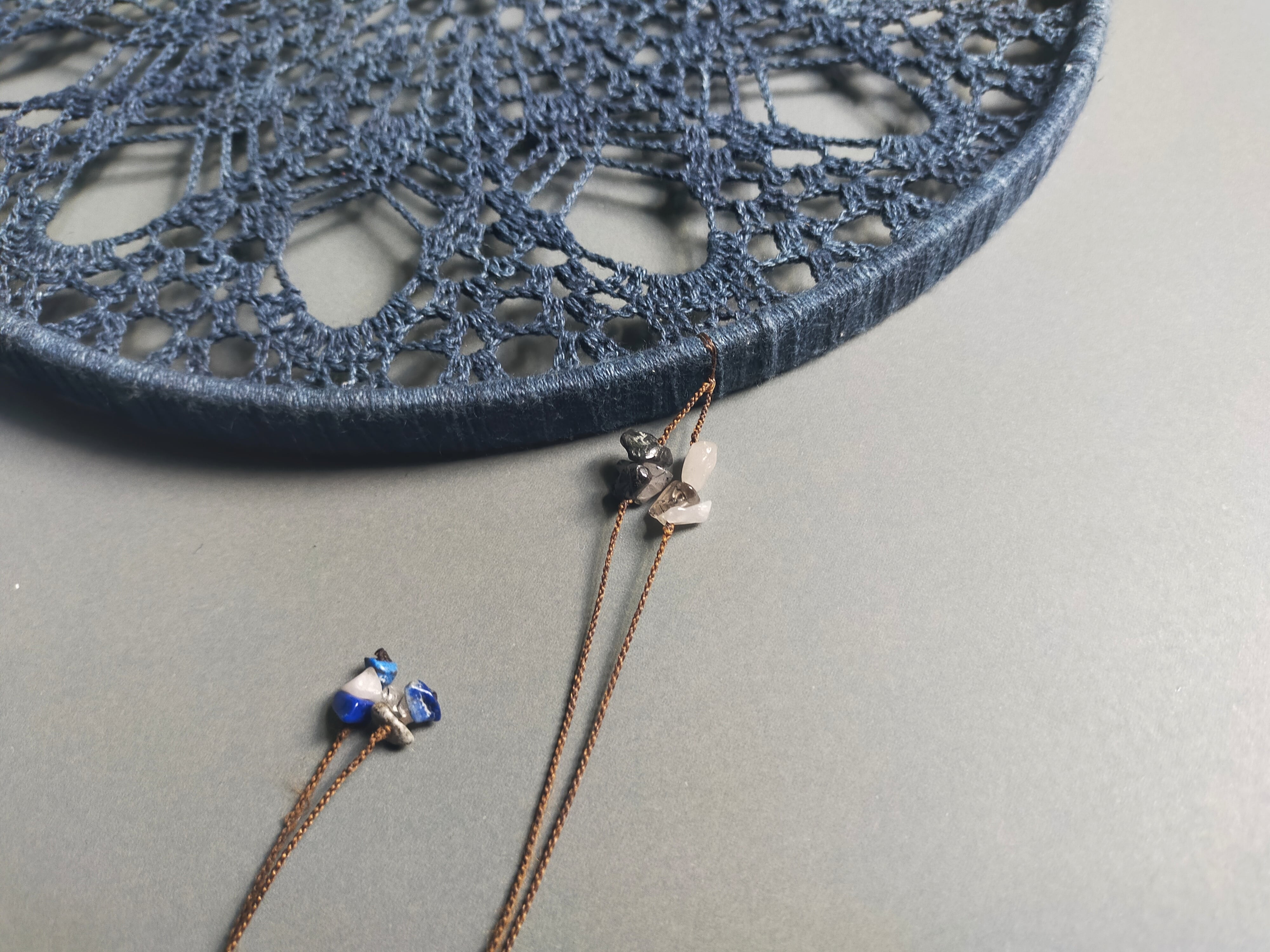 素材:タイの天然藍染めの100%麻糸を使用。上部吊り紐、下部吊り紐にワックスコードを使用。ラピスラズリ、ブラックルチルクォーツ石を散りばめています。