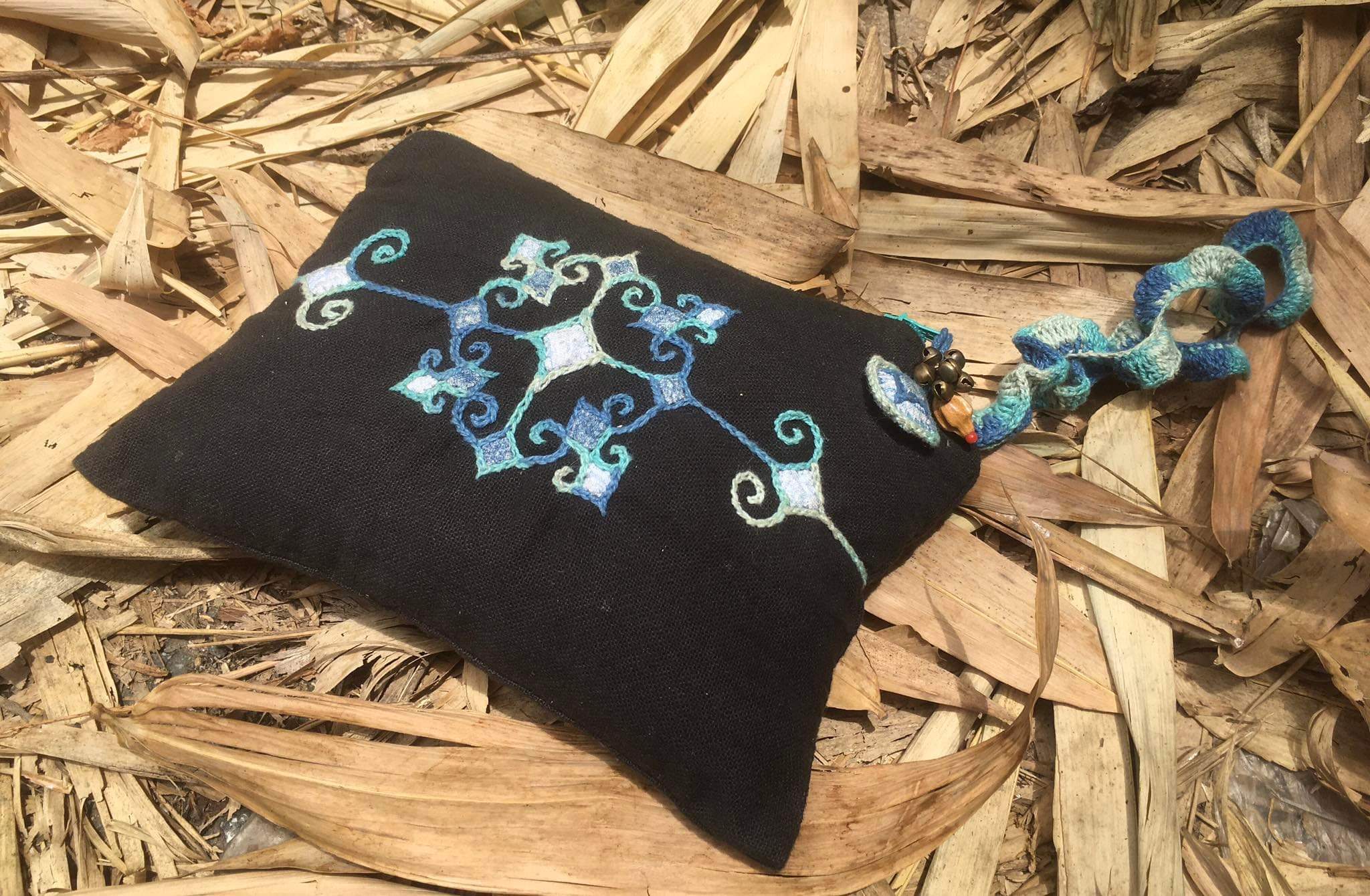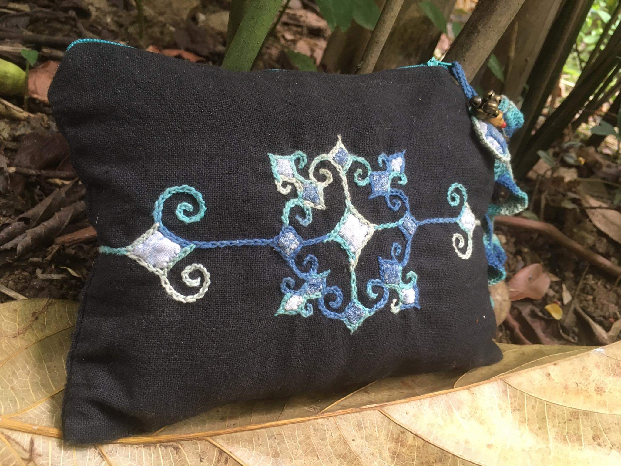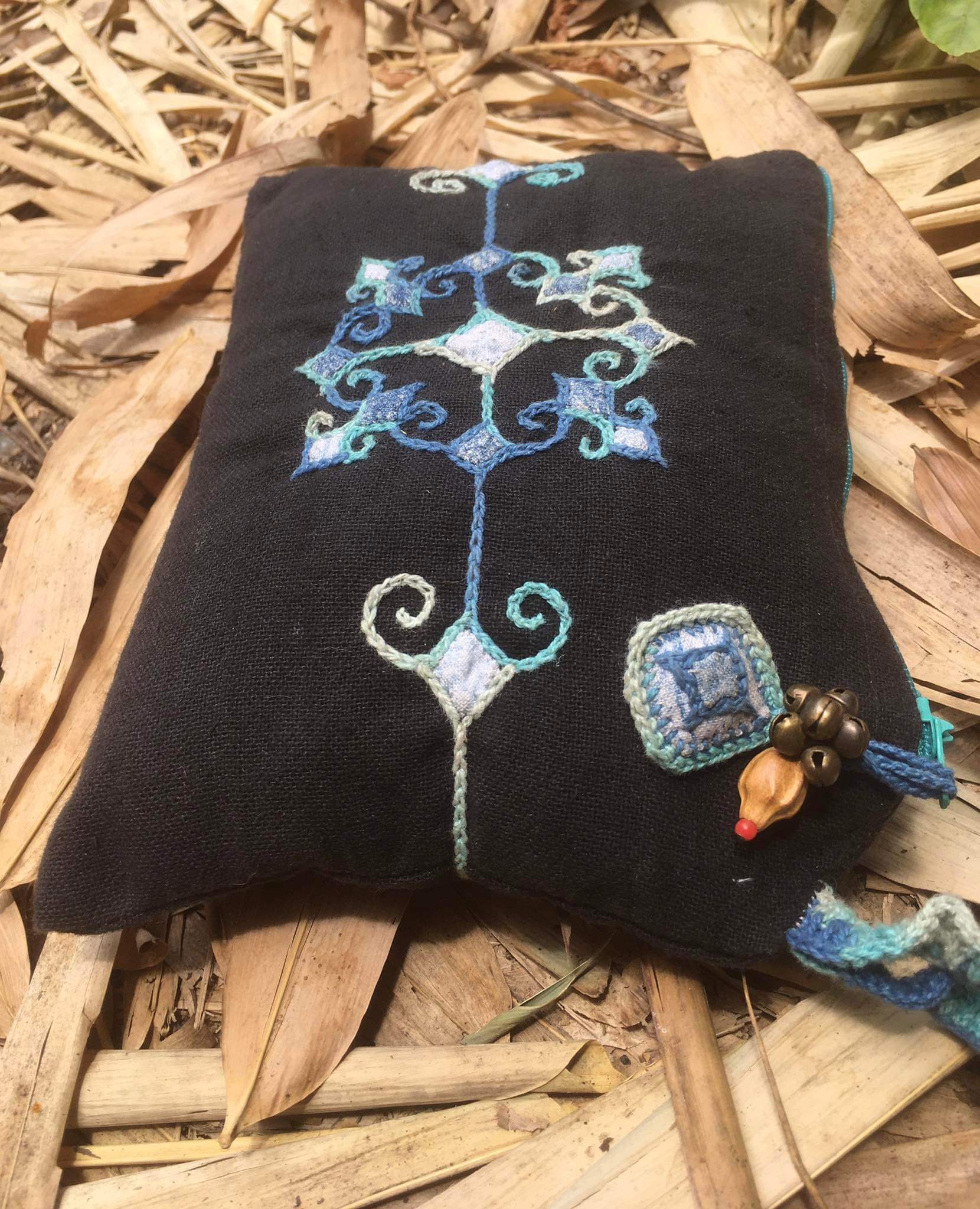 ファスナー部分に麻糸で編んだアクセサリーや鈴をつけてアクセントになっています。