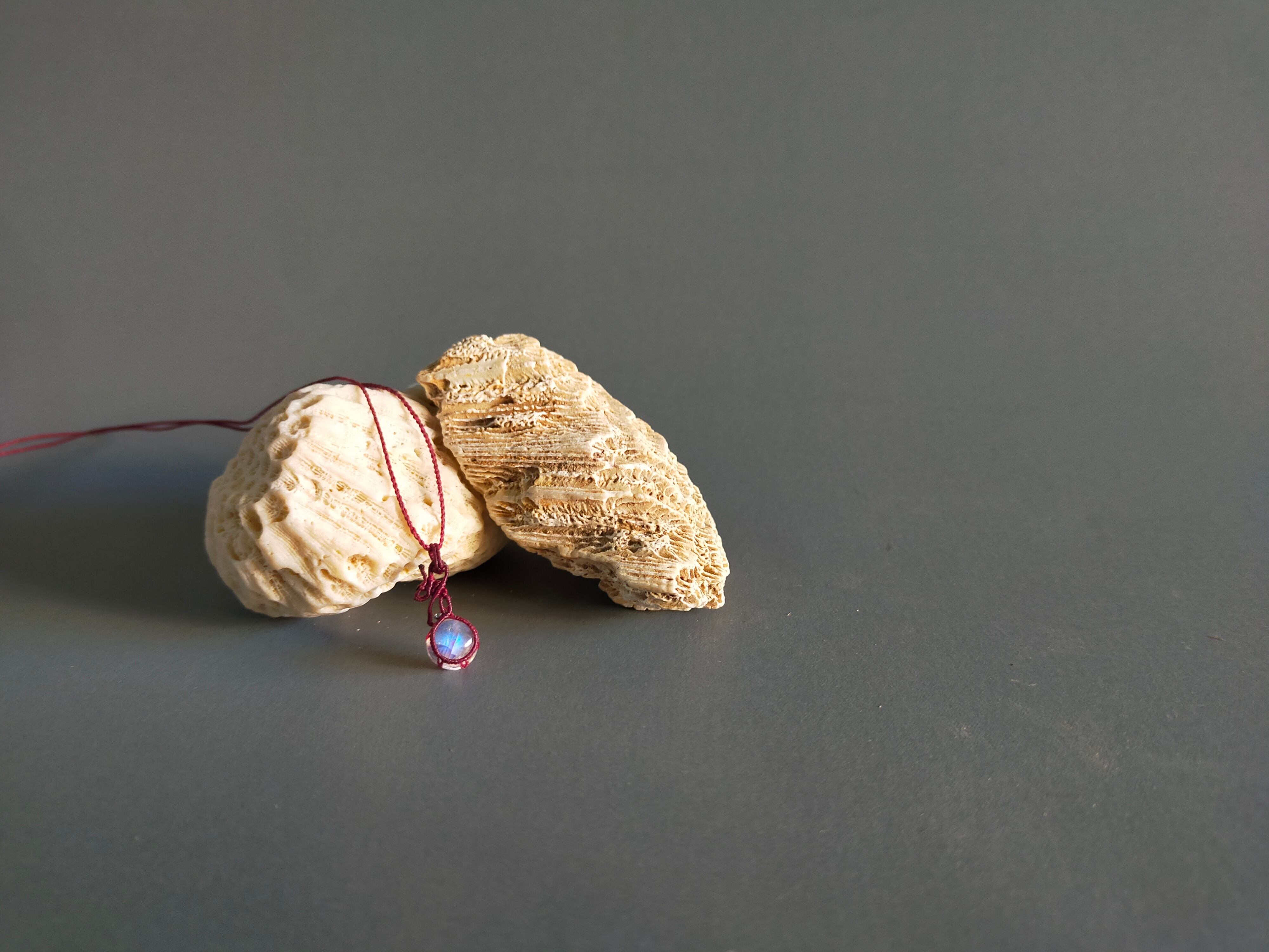 ☆0.20mmのワックスコードを2つにさいて使用していますので、一本あたり超極細の0.10mmになっております。紐部分は、4つ編みで編んでおります。