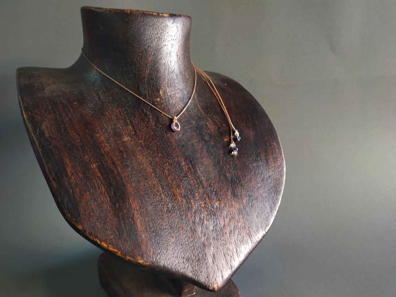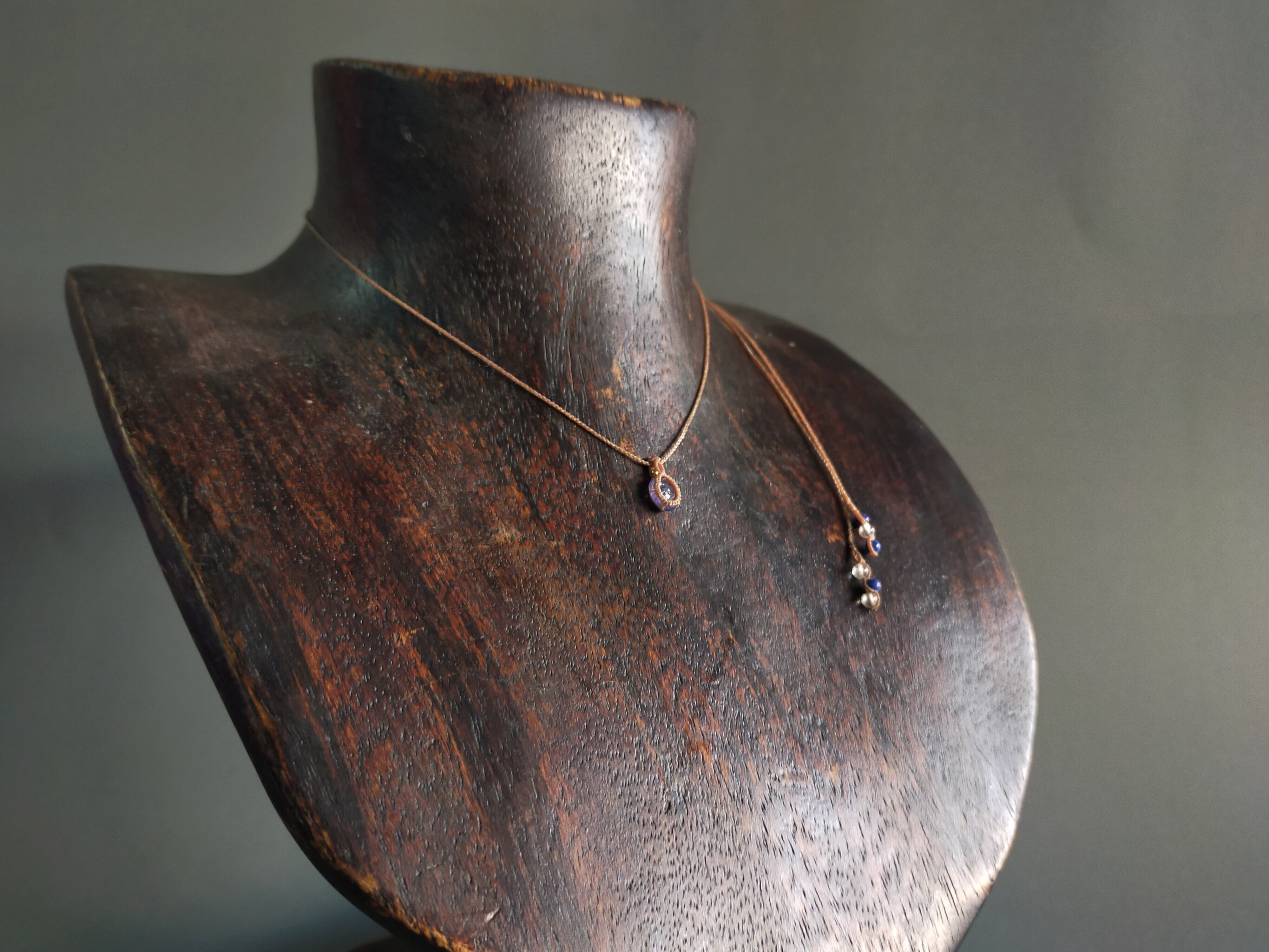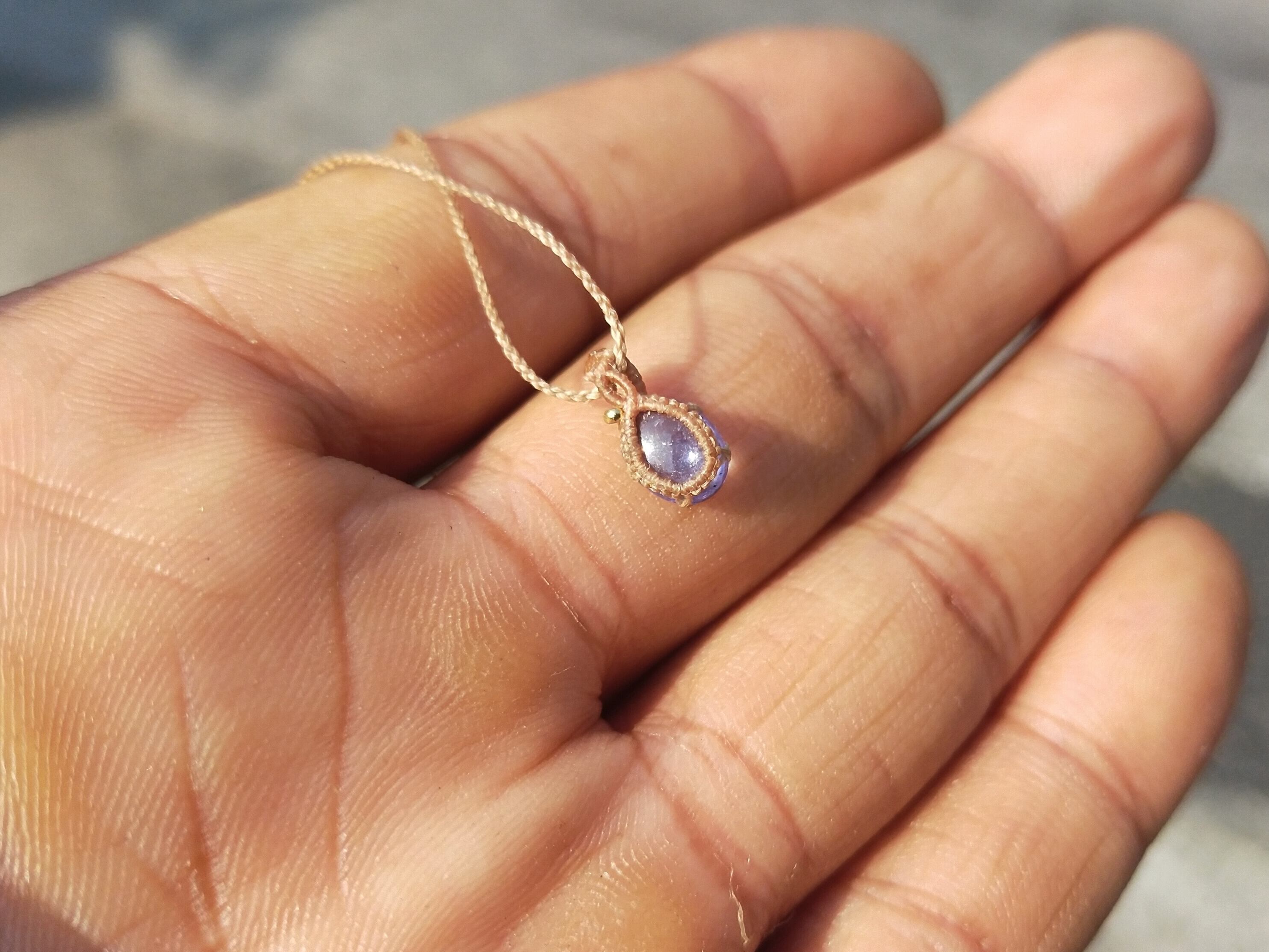 ☆0.20mmのワックスコードを2つにさいて使用していますので、一本あたり超極細の0.10mmになっております。紐部分は、4つ編みで編んでおります。
