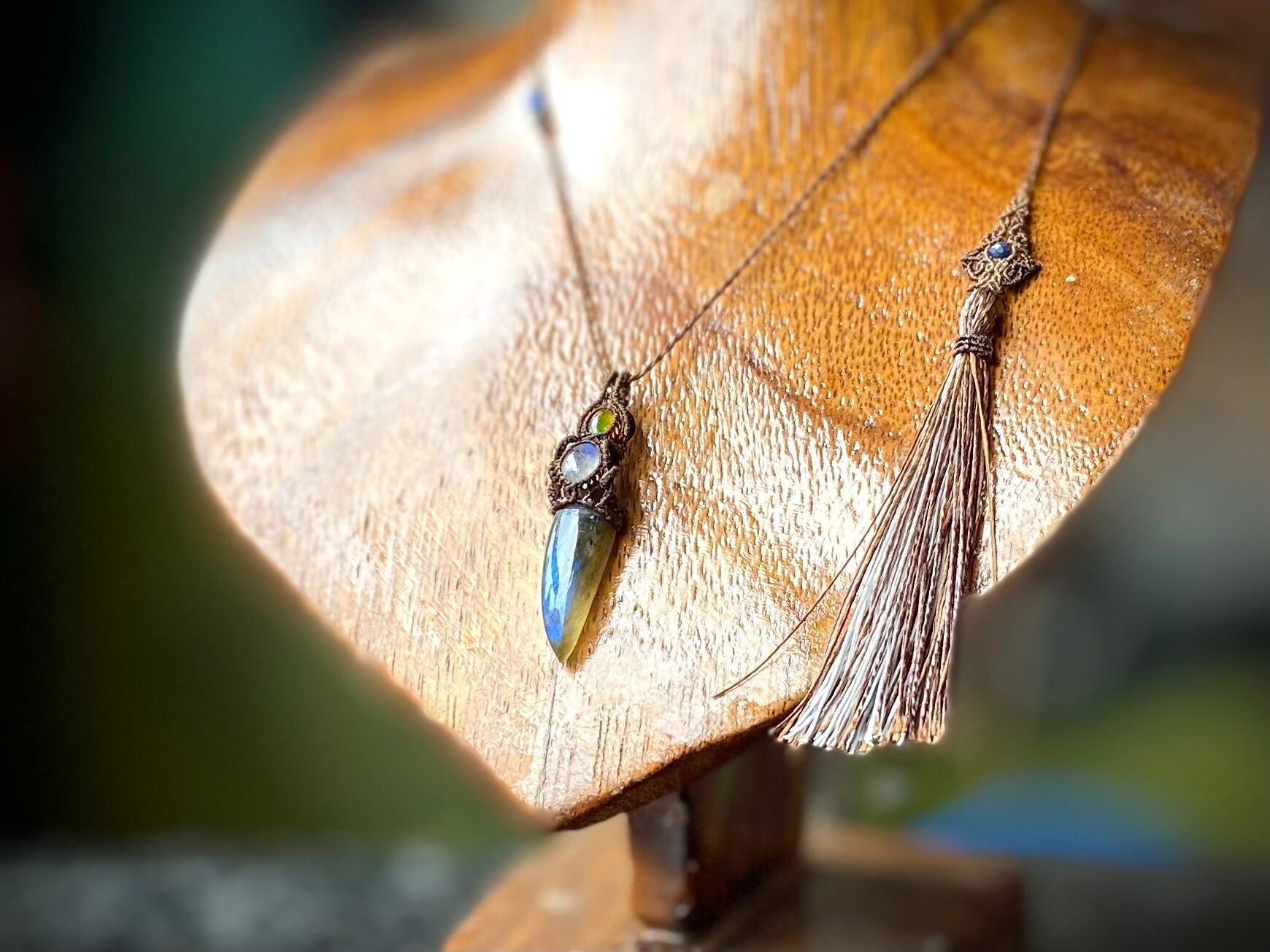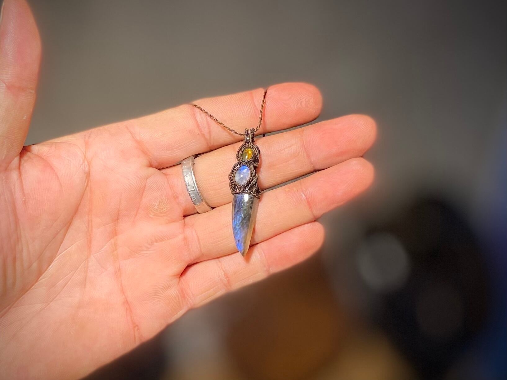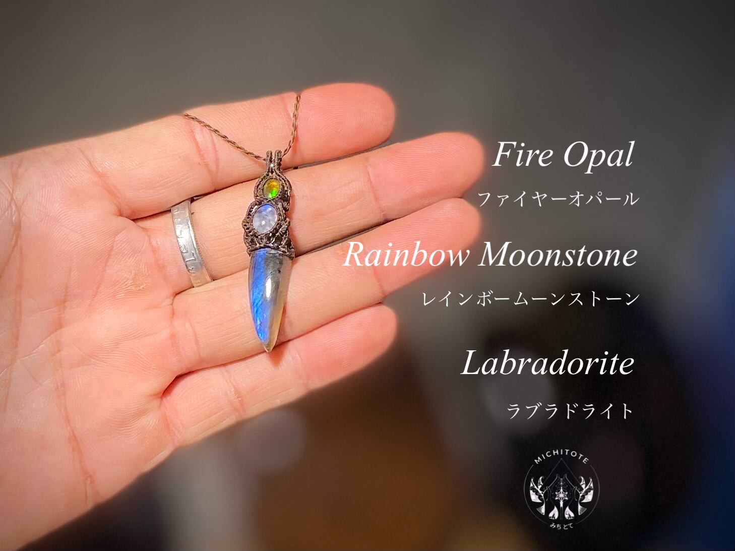 ラブラドライトとファイヤーオパールとレインボームーンストーンを使った新作ネックレスです。