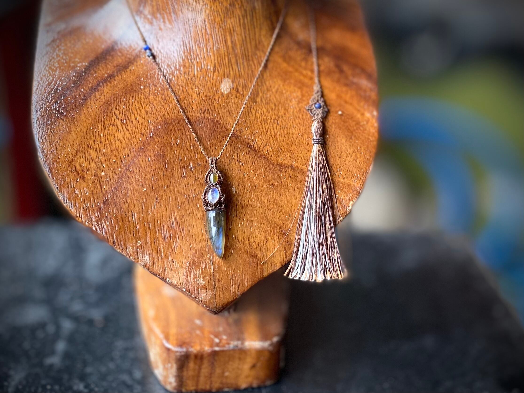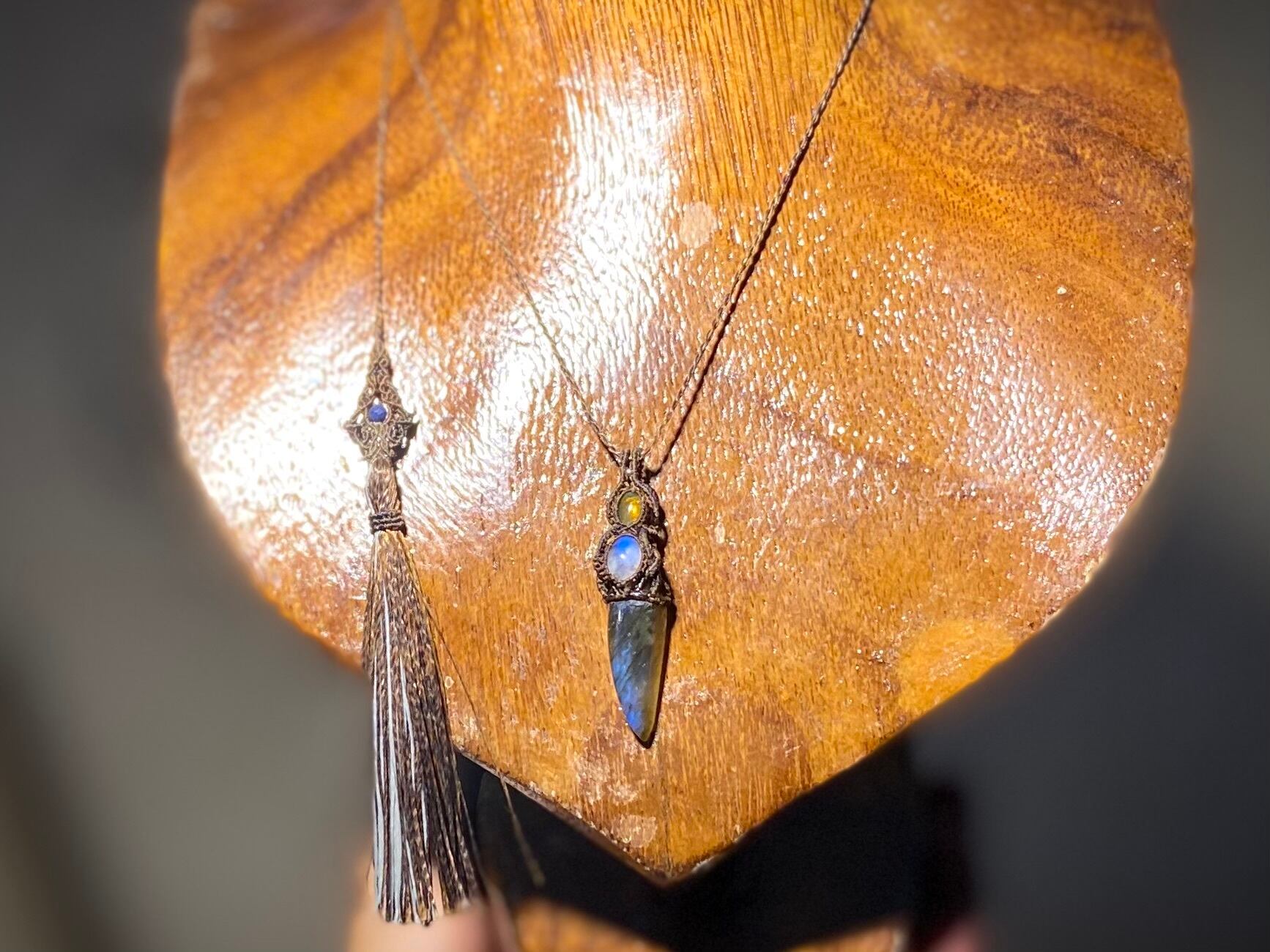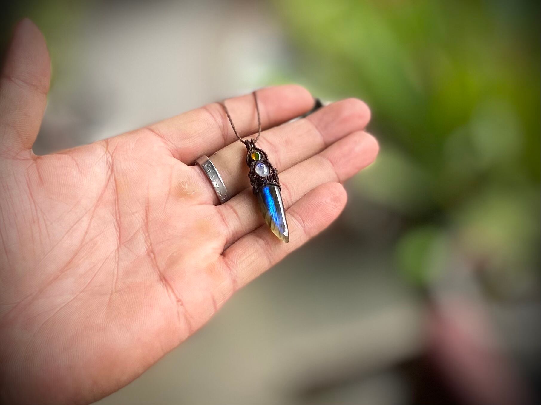 ラブラドライトとファイヤーオパールとレインボームーンストーンを使った新作ネックレスです。